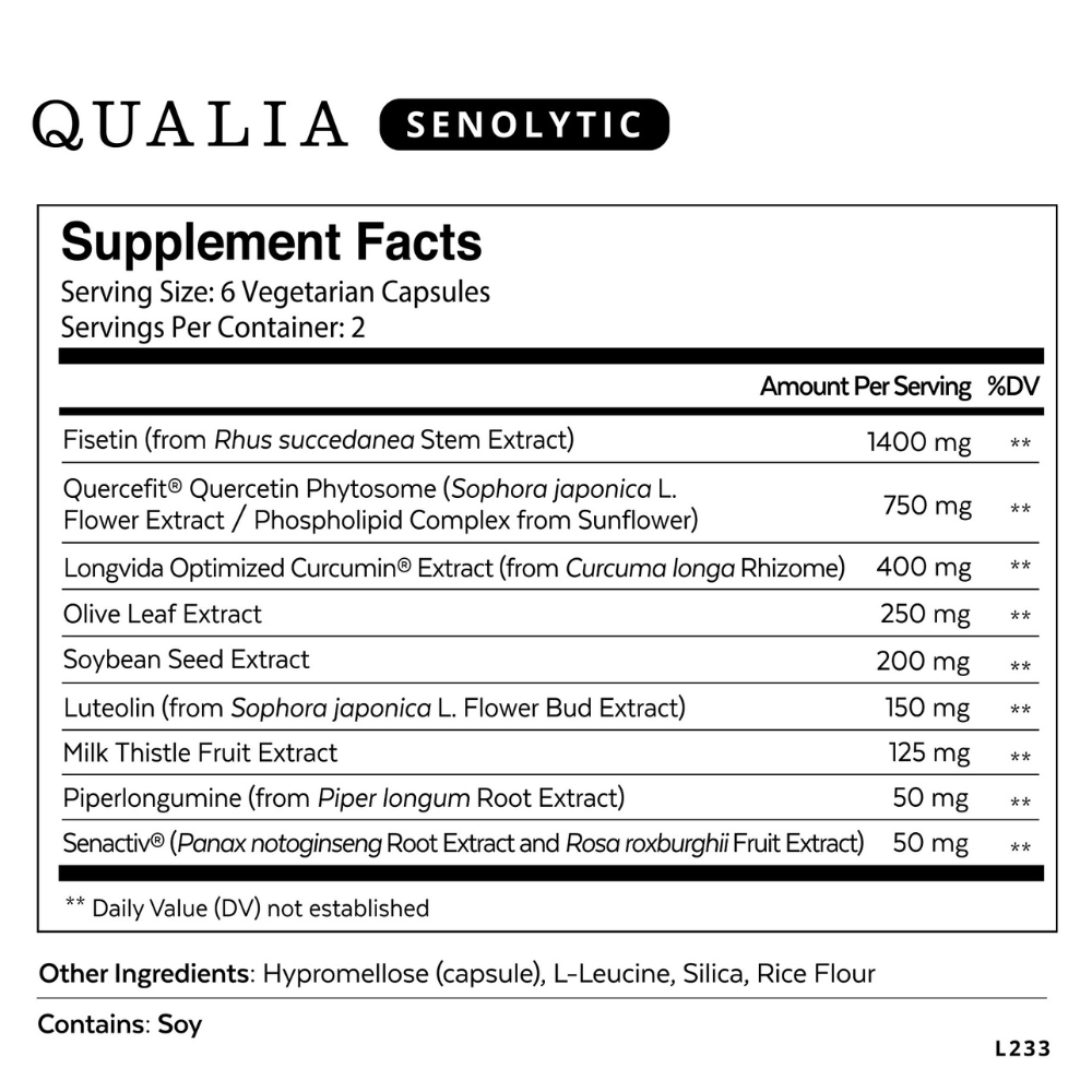 Since senescent cells are experts at surviving, the formula couldn’t rely on just a single ingredient to deliver results. Instead, a multi-pronged approach helps give the body the best opportunity to reduce its senescent cell load. Qualia Senolytic provides rare and powerful compounds that have scientifically shown senolytic activity, and which collectively cover a broader range of mechanisms than existing senolytic supplements on the market.*